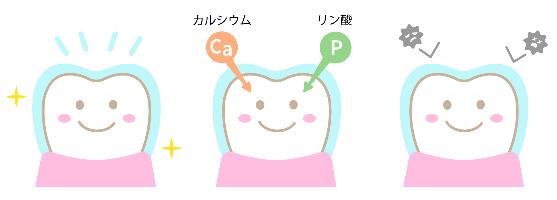 フッ素は唾液中のカルシウムやリンと結合し、歯の表面を再び硬くする「再石灰化」を促進します。これにより、虫歯菌が酸を作り出しても、歯が修復されやすい状態を維持できます。
