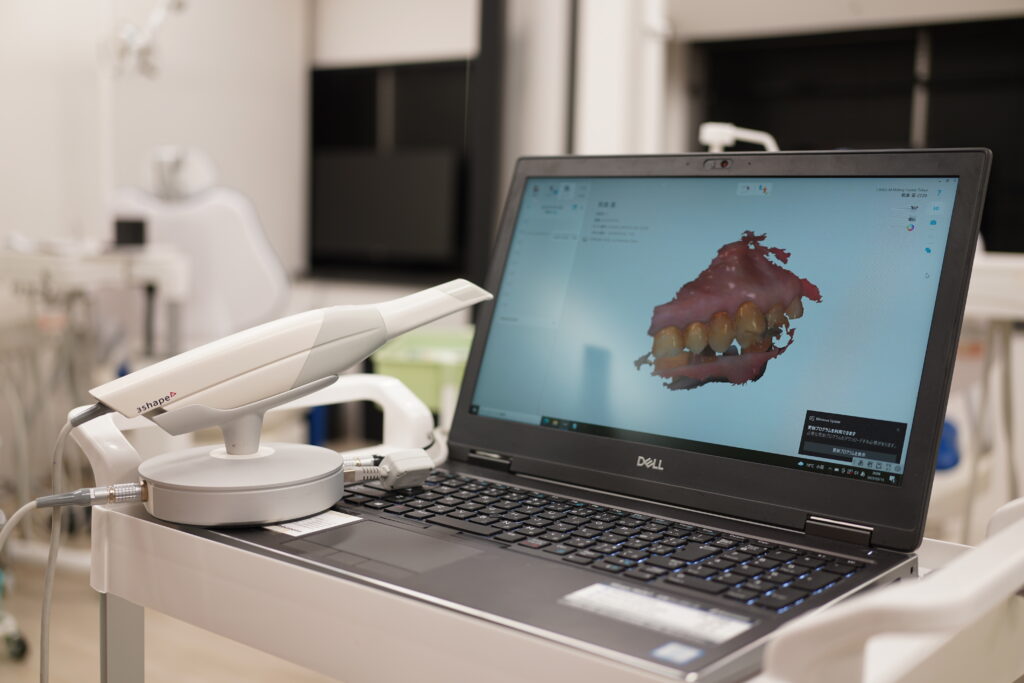 型取りは口腔内スキャナーを用いて行います。口腔内スキャナーは、口の中を小型カメラでスキャンし、歯や歯茎の形状を3Dデータとして取得する医療機器です。従来の粘土印象材を使用する方法とは異なり、短時間かつ快適に歯型を採取できます。