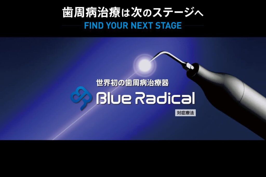 ブルーラジカルとは、光と薬剤を組み合わせ、ヒドロキシルラジカルを発生させることで歯周ポケット内の細菌を殺菌する新しい歯周病治療器です。歯ぐきの深い部分に潜む細菌を狙って除去できるため、歯周病の進行抑制に役立ちます。従来の外科的な処置に比べ、身体への負担が軽い「低侵襲治療」として注目されています。