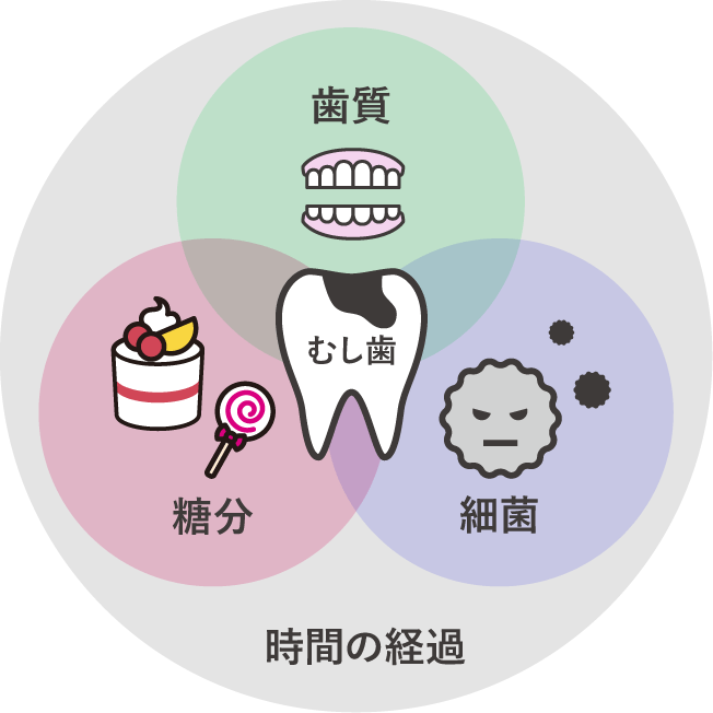 虫歯は「歯の質」「糖質」「細菌」「時間」という4つの要素が重なることで発生すると考えられています。これは歯科医学で「カイスの輪」と呼ばれる基本的な考え方です。